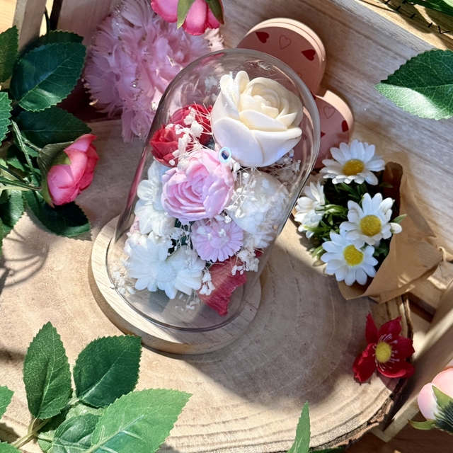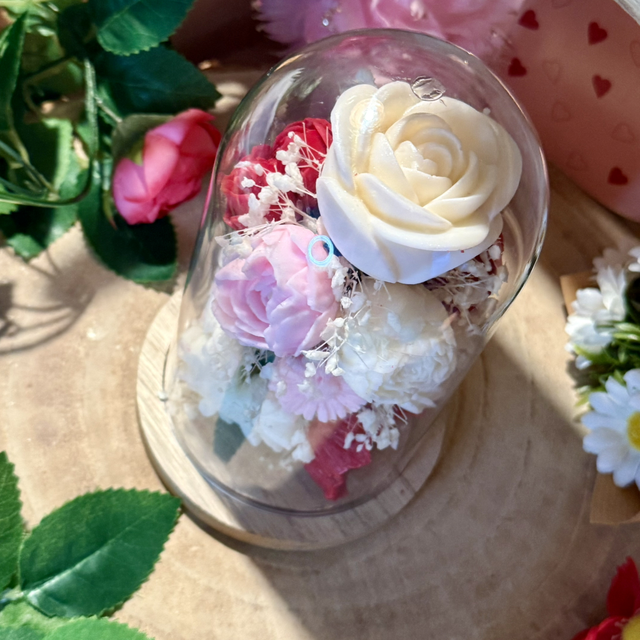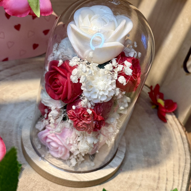 Une exclusivité, un joli bouquet de fondants avec des fleurs rouges, roses et blanches. Le tout mis sous cloche ! Un cadeau original pour votre moitié. 💕